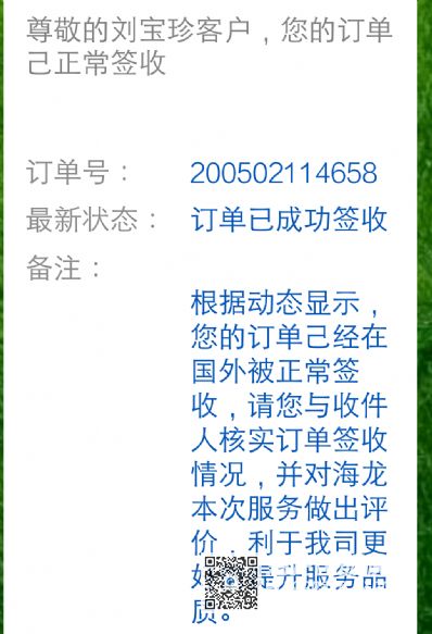 因为是第一次在海龙国际邮寄东西。所以操作程序和步骤不熟悉。海龙国际客服黄小姐Aimee耐心细致,不厌其烦地反复指导。为了方便交流指导她主动加了我的微信。不怕笑话本人笨(老人60多岁),理解反应慢。在微信聊天记录里黄小姐Aimee共发了文字信息68条。每个步骤指导操作。非常感谢!