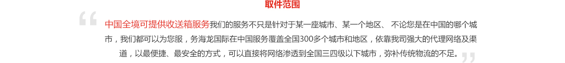 备注:如取件地址为偏远地区或有特殊时间要求及其他特殊情况,我司可以尝试安排其他物流或快递公司取件(所产生额外的费用将由发件人承担);县级以上城市,均可上门取件,县级以下偏远城市可通过当地邮局等渠道将物品寄至海龙仓库,海龙会承担本次邮寄的部分运费。请您根据托运物品情况将物品取件信息提供给我司,以免产生额外费用。