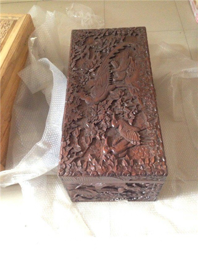这是另外一件衣物箱,整个箱子上都是雕花,看木料确实很不错,应该是红木的