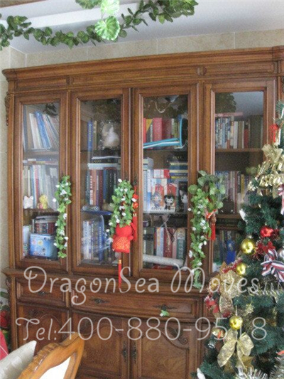 看看客户的书柜,满满当当,书柜外面挂满了绿色装饰,旁边还有一颗圣诞树~