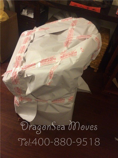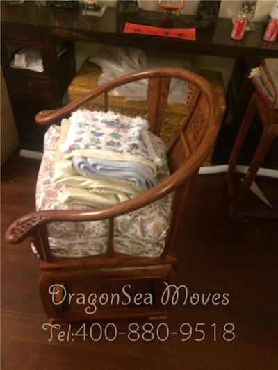 客户家的太师椅,由于这类家具空隙较大,为了防震,在包装的时候在椅子上放了部分衣物被褥充当填充材料
