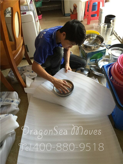 厨具的打包,与杯子等小瓷器包装稍显不同,稍大号的物品除用绵白纸外还得用上珍珠棉