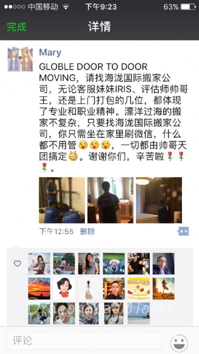 GLOBLE DOOR TO DOOR MOVING,请找海龙国际搬家公司,无论客服妹妹IRIS、评估师帅哥王,还是上门打包的几位,都体现了专业和职业精神。漂洋过海的搬家不复杂,只要找海龙国际搬家公司,你只需坐在家里刷微信,什么都不用管[调皮][调皮][调皮],一切都由帅哥天团搞定[呲牙]。谢谢你们,辛苦啦[玫瑰][玫瑰][玫瑰]。 尊敬的客户:您好!感谢您使用我司从上海市到加拿大的国际搬家服务以及对我司工作人员服务的评价,您的满意是我司最大的动力,我司作为私人物品国际运输行业领导者,有着丰富的家具海运门到门搬家经验,后期会一如既往的为您提供方便快捷,放心的服务,将您此次搬家物品安全送达您的目的地的“家”中!