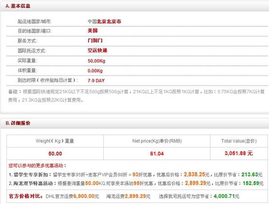 例:从北京到美国如果是50公斤,每公斤大概是58元