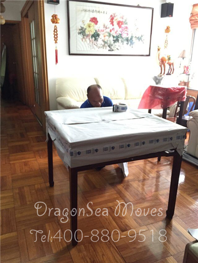 包装师傅在为餐桌做第一层包装: