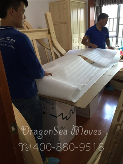 小刚正在包装家具,珍珠棉包裹防震